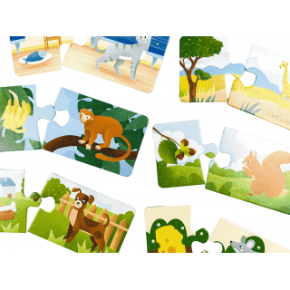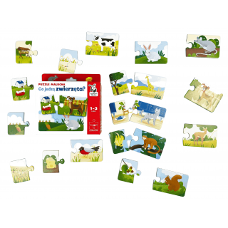 Puzzle malucha Co jedzą zwierzęta? to zestaw 10 dwuelementowych puzzli przedstawiających zwierzęta gospodarskie oraz egzotyczne w realistycznym otoczeniu. W czasie zabawy z puzzlami maluchy poznają bliższe i dalsze otoczenie, rozwijają wiedzę o świecie oraz ćwiczą koncentrację uwagi. Dzięki próbom dopasowywania do siebie elementów doskonalą koordynację oko-ręka.