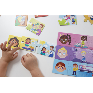 Emocje. Puzzle malucha to kolorowe puzzle przedstawiające scenki z życia maluchów. Małe dzieci, układając 3-elementowe puzzle, uczą się rozpoznawania i nazywania emocji oraz poznają różnorodne strategie radzenia sobie z nimi. Rozwijają przy tym wyobraźnię emocjonalną, spostrzegawczość oraz ćwiczą motorykę małą, dopasowując do siebie elementy.
