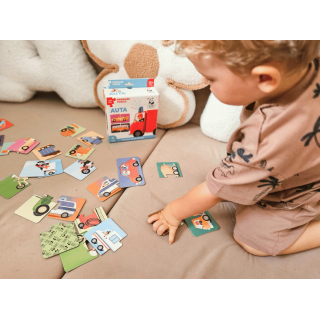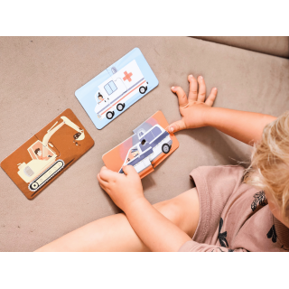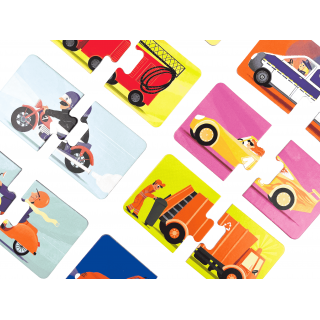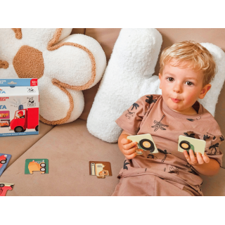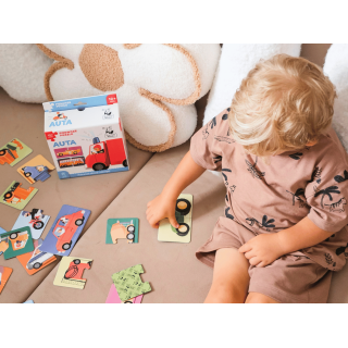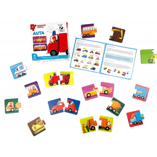 W pudełku znajduje się 15 dwuelementowych układanek przedstawiających uwielbiane przez dzieci pojazdy, m.in.: auto, traktor, koparkę, śmieciarkę czy skuter. Dzięki kolorowym ilustracjom zabawa z puzzlami uczy również odróżniania kolorów i kształtów oraz ćwiczy sprawność dłoni i palców.