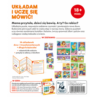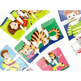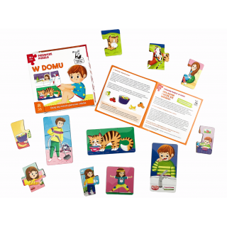 6 dwuelementowych kwadratów i 8 trójelementowych prostokątów, ilustrujących codzienne czynności w domu. Obrazki przedstawiające dorosłych, dzieci i zwierzęta zachęcają do poznawania nazw czynności i formułowania prostych zdań. Układanki uczą również rozróżniania kolorów i rozwijają logiczne myślenie.