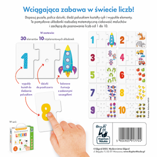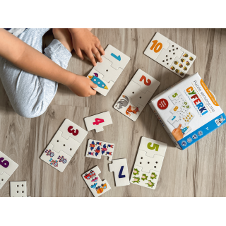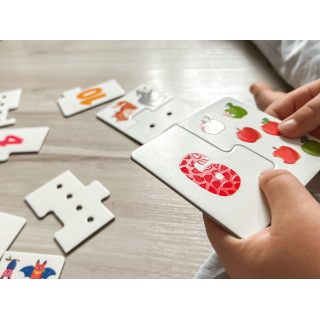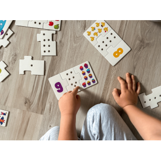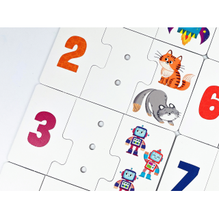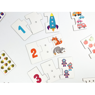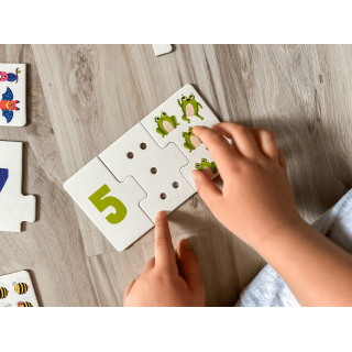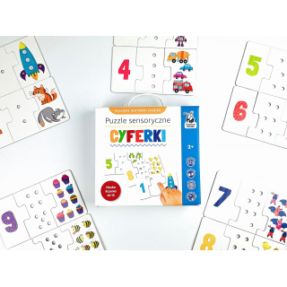 Puzzle sensoryczne. Cyferki to zestaw trójelementowych puzzli do nauki cyferek od 1 do 10 dla dzieci od 2. roku życia. Zabawka angażuje zmysł dotyku, wypukłe elementy zachęcają do wodzenia po nich paluszkiem. Dzięki temu dziecko wciąga się w naukę cyferek, a przy okazji ćwiczy koncentrację, koordynację oko-ręka i motorykę małą.