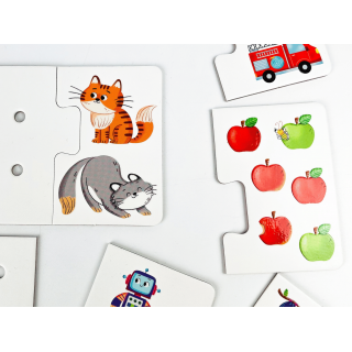 W pudełku znajduje się 10 trójelementowych układanek (łącznie 30 elementów). W skład każdej układanki wchodzą: