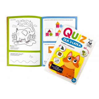 Quiz dla 3-latka. Książka z naklejkami to wciągające zagadki, które trenują myślenie logiczne i poszerzają wiedzę o świecie, a zawarte na kartach książeczki kolorowe ilustracje angażują uwagę dziecka i zachęcają do koncentracji na szczegółach. Zadania osadzone są w bliskiej dziecku tematyce życia codziennego, domu, przedszkola, czasu wolnego, miasta, wsi, spaceru i wakacji.