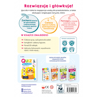 Quiz dla 4-latka. Książka z naklejkami to wciągające zagadki, które rozwijają logiczne myślenie i poszerzają wiedzę o świecie. Kolorowe ilustracje przyciągają uwagę dziecka i zachęcają do skupienia się na szczegółach. Zadania są oparte na codziennych doświadczeniach dziecka, takich jak życie domowe, przedszkole, czas wolny, miasto, wieś, spacery i wakacje. Odkryjcie, jak fascynujący jest świat, i cieszcie się zabawą!