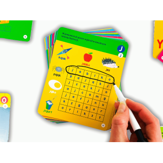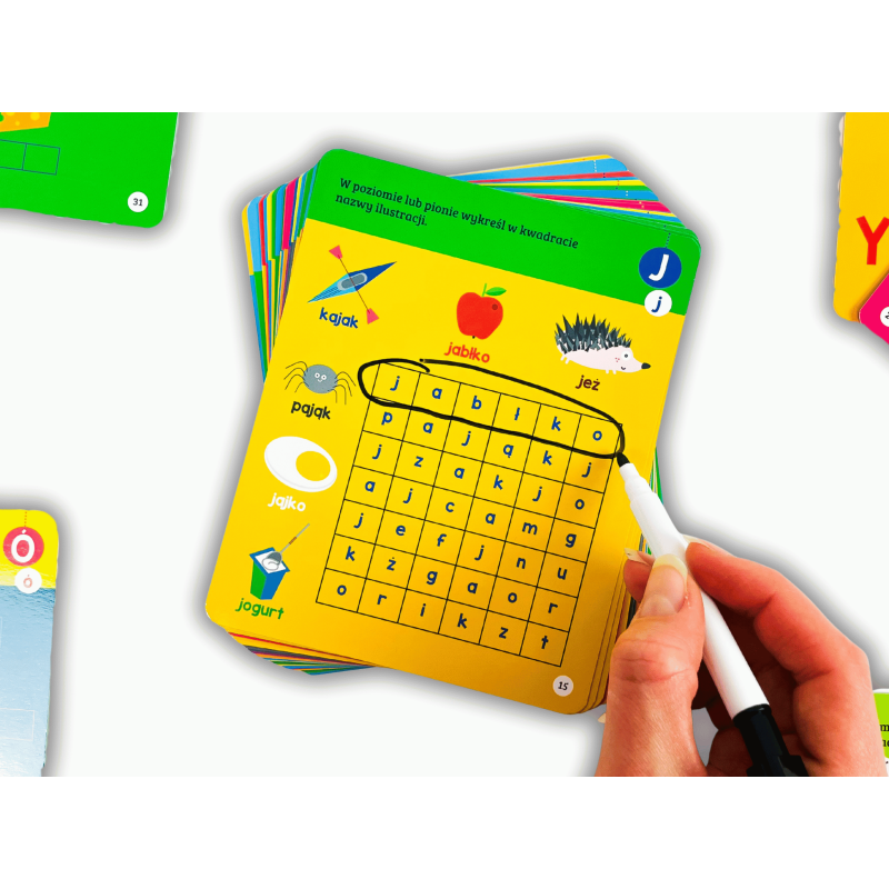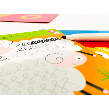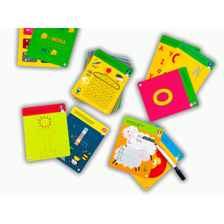 W pudełku znajduje się 60 zadań na kartach zmywalnych oraz flamaster ścieralny, dzięki czemu ćwiczenia można wykonywać wielokrotnie. Zadania zostały opracowane przez doświadczone nauczycielki edukacji wczesnoszkolnej i zilustrowane w sposób, który przyciąga uwagę dziecka i zachęca do samodzielnej pracy.
