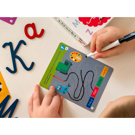 Dzięki różnorodnym zadaniom dzieci poznają literki, uczą się rozpoznawać wśród innych znaków, łączyć je z dźwiękami mowy oraz odczytywać proste wyrazy. To naturalna i angażująca nauka liter, oparta na aktywnym działaniu i dziecięcej ciekawości świata. Zadania to solidny trening ręki i oka. Dziecko rysuje po śladzie, przechodzi labirynty z literami, wyszukuje wyrazy w wykreślankach, dzieli słowa na sylaby i rozwiązuje rebusy obrazkowo-wyrazowe. Tak zaprojektowane ćwiczenia grafomotoryczne rozwijają precyzję ruchów dłoni, koordynację wzrokowo-ruchową oraz przygotowują do nauki pisania.